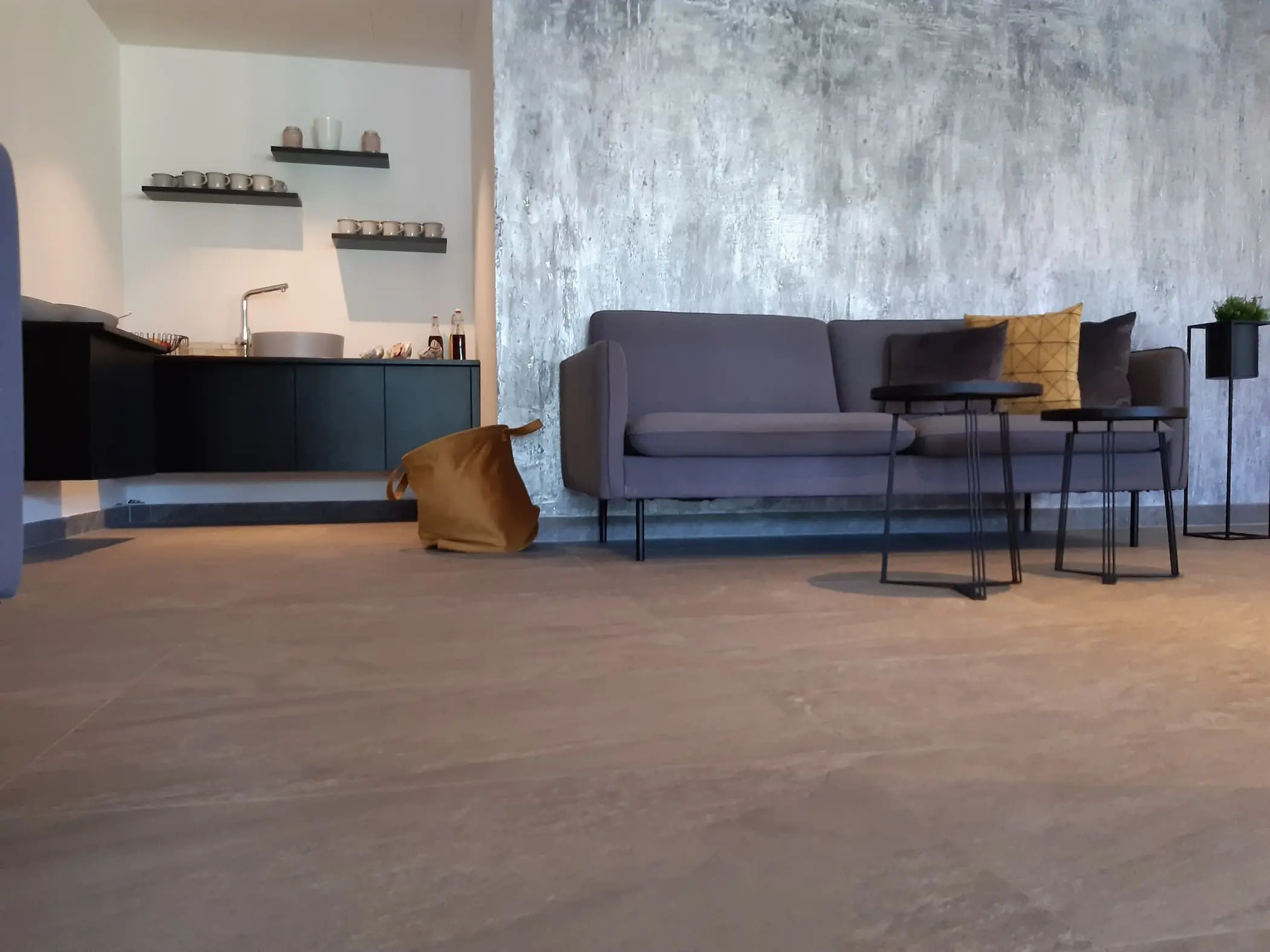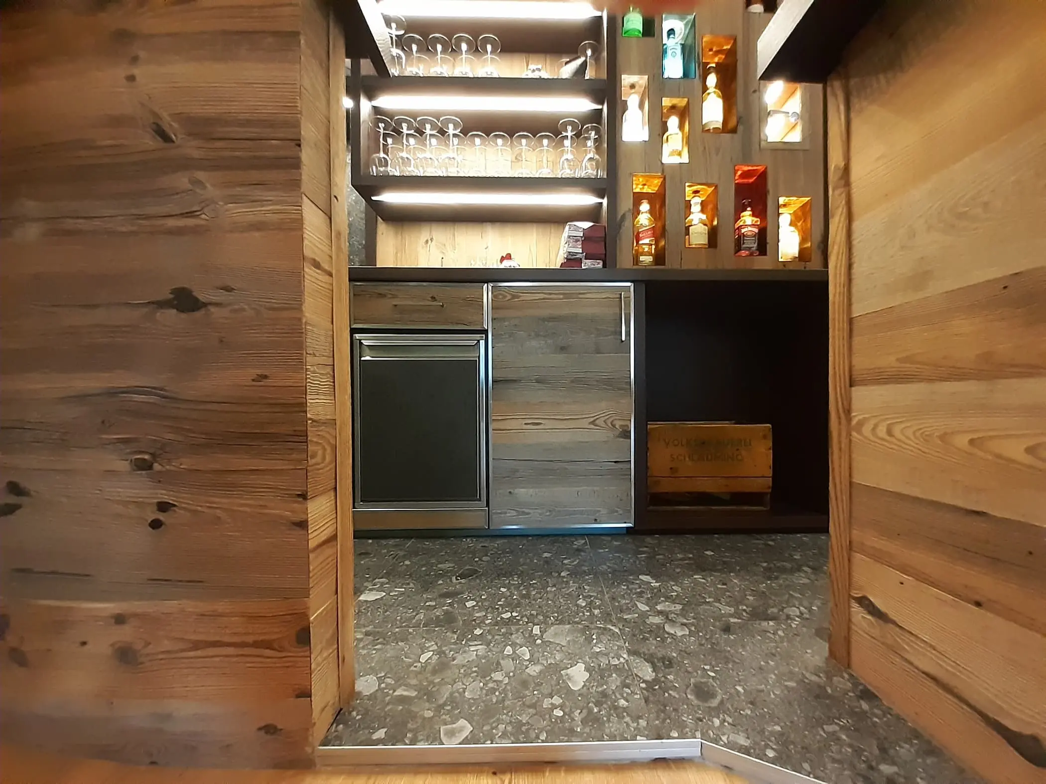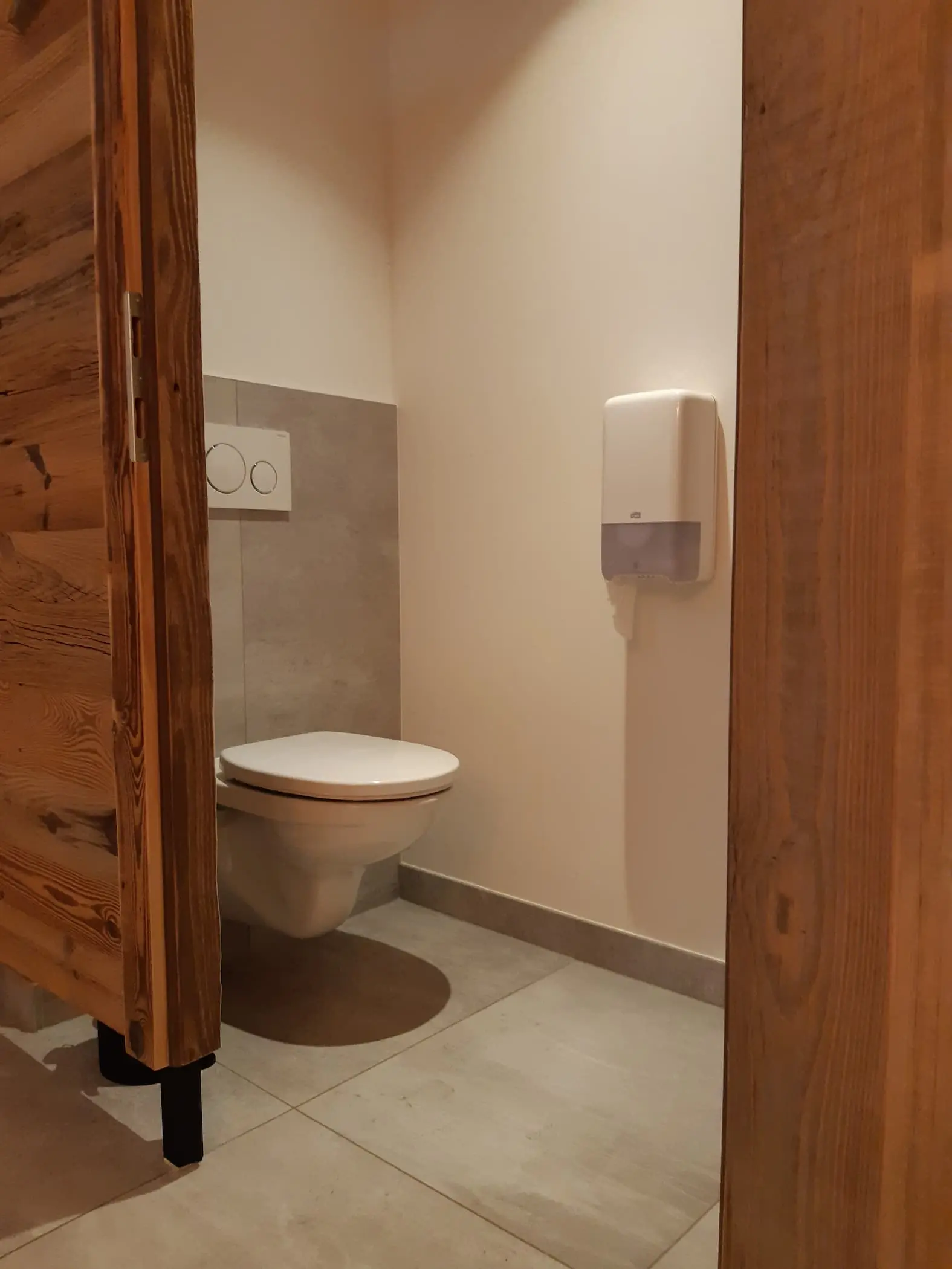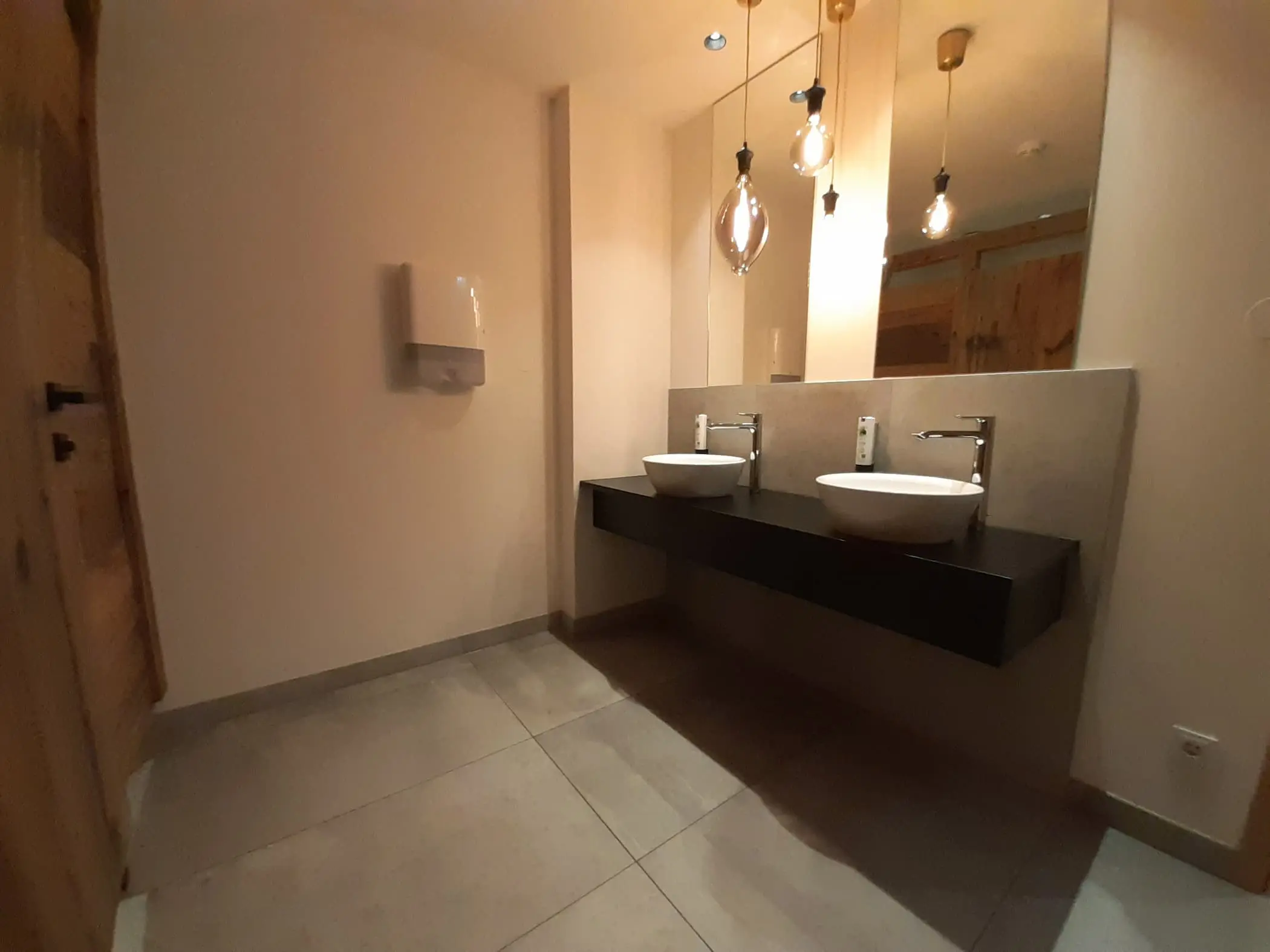 Im von Gastgeber Manuel designten Barbereich, wurden robuste, dunkle Bodenfliesen verlegt, während in den Gäste-WC-Anlagen helle Wand- und Bodenfliesen zum Einsatz kamen.
