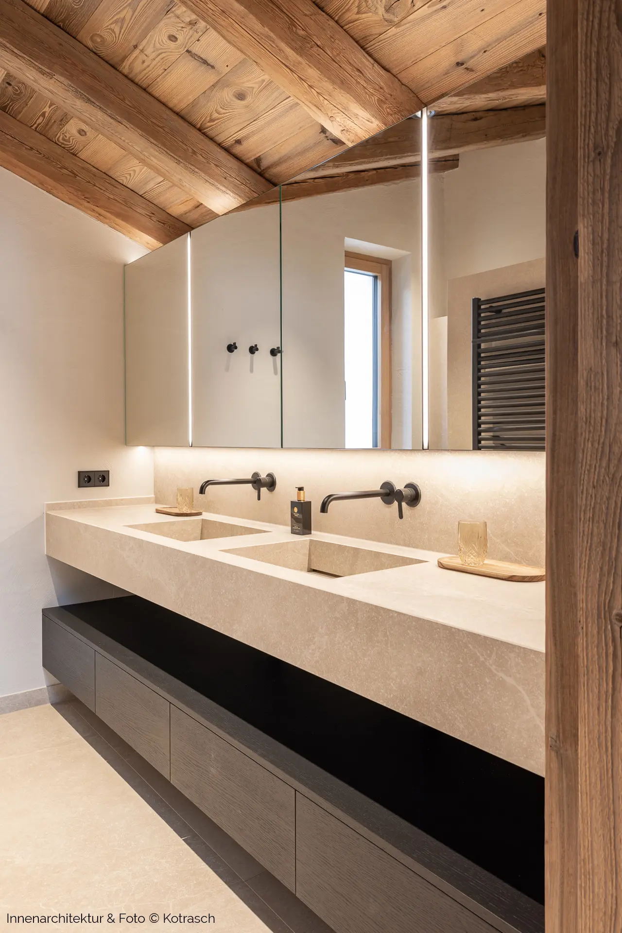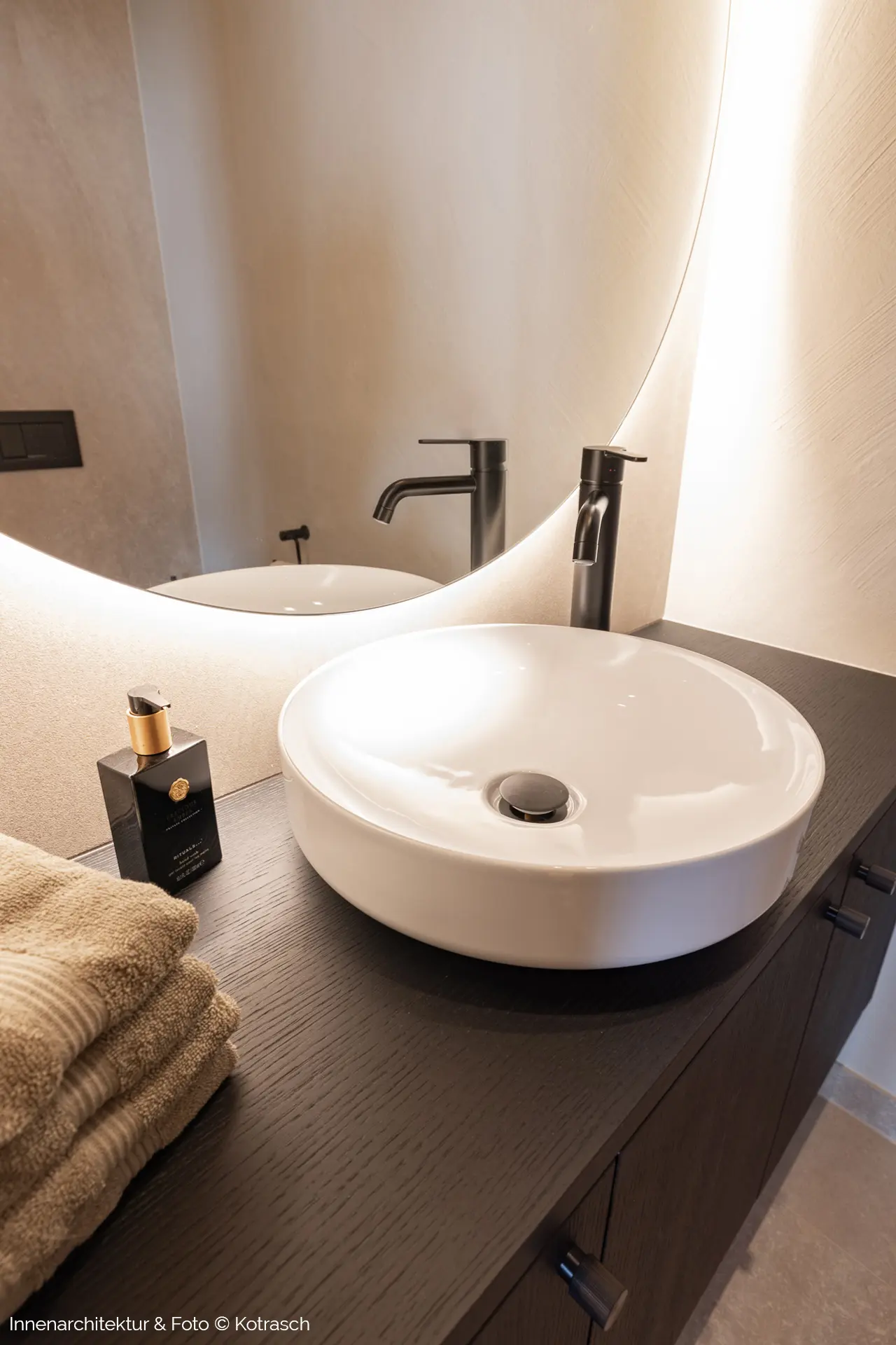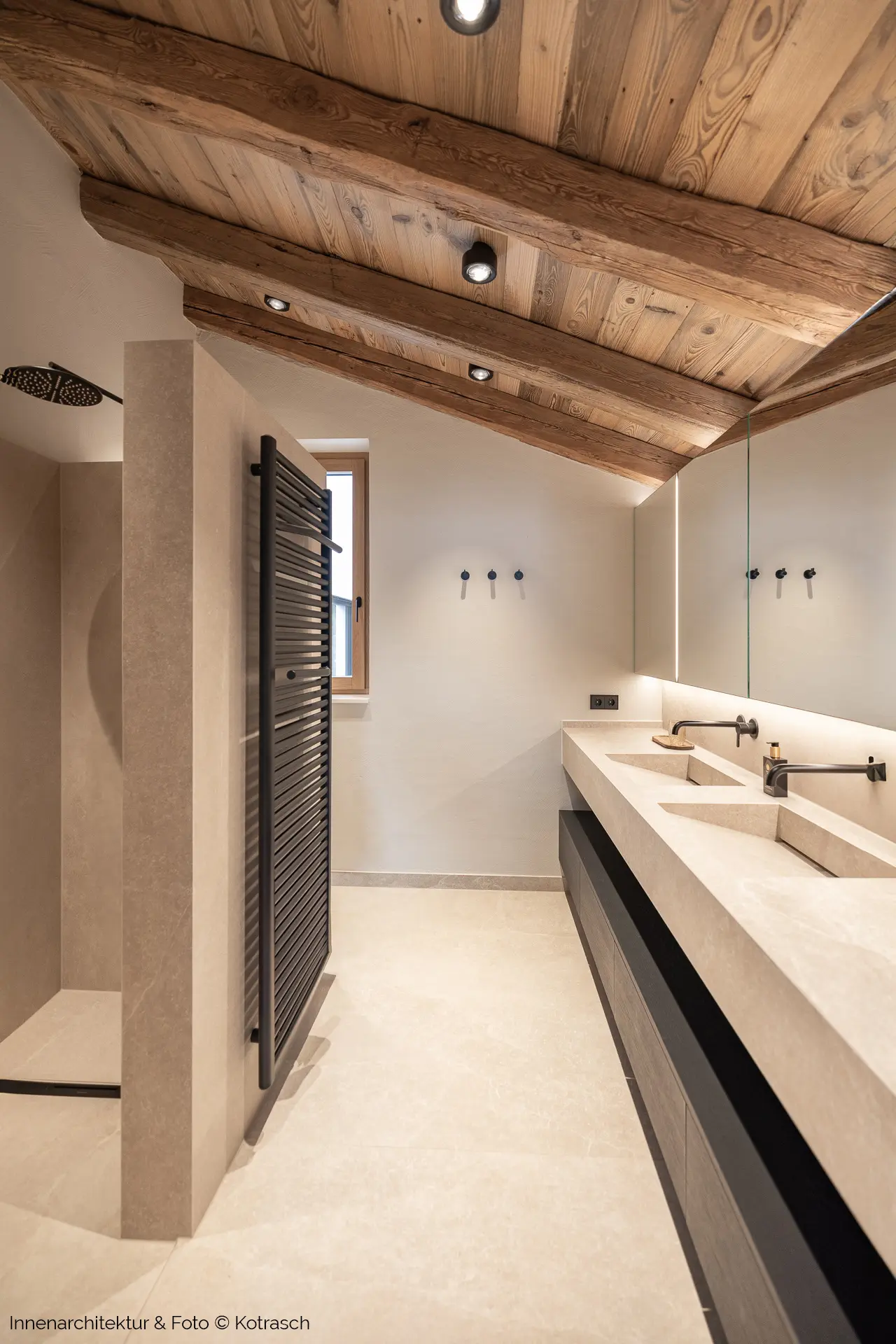 Bei dem Neubau dieser Villa, die gekonnt Elemente aus Tradition und Moderne kombiniert, haben wir großflächige, helle Fliesen verlegt, die den edlen Charakter des Hauses perfekt unterstreichen.